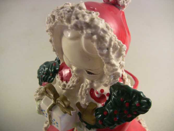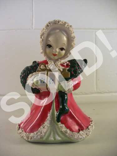 Vintage Christmas Planter Chalkware Figurine Spaghetti Trim Christmas Girl Shopper