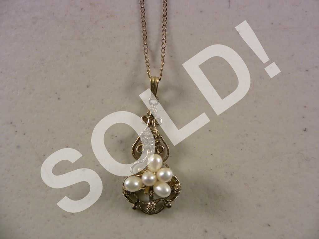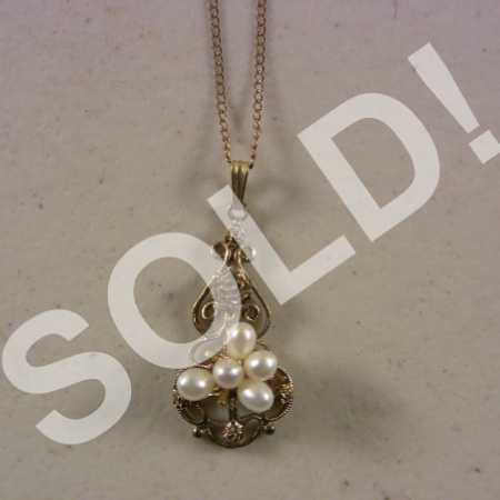 Pretty vintage antiqued gold filigree roses and mini faux pearls chain pendant necklace