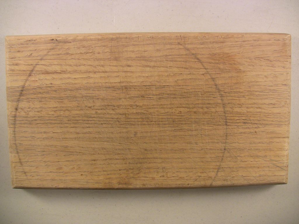 Good used vintage condition with wear from age and use.  Cut marks, scratches, staining, age splits; one large dark circular ring stain.  Beautiful grain.