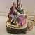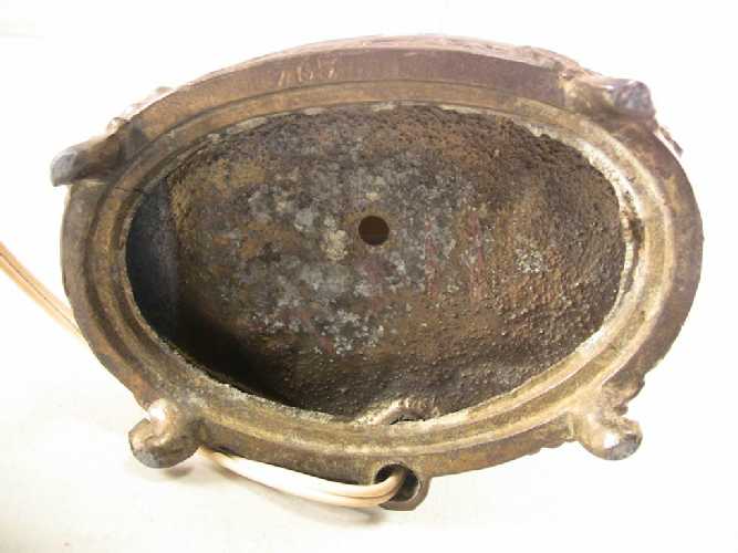 Good vintage condition with wear from age and use. Front left foot of base has a crack. Finish wear, oxidation, and patina on all metal parts. Some paint flaking, mostly on the man's red coat, very minimal elsewhere. Electrical cord is stiff and discolored, but good. Lamp is in good working order, but should be inspected before regular use. No shade included.