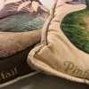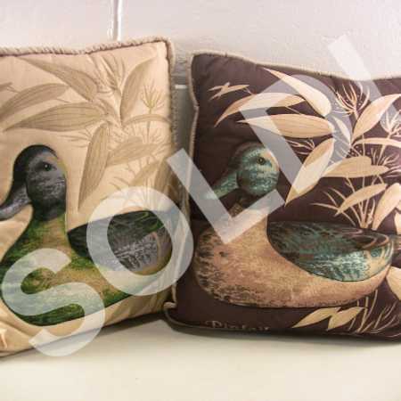 The pillows each have complimentary color schemes, and "Pintail" caption in lower left, tan piped edges and solid color backs.