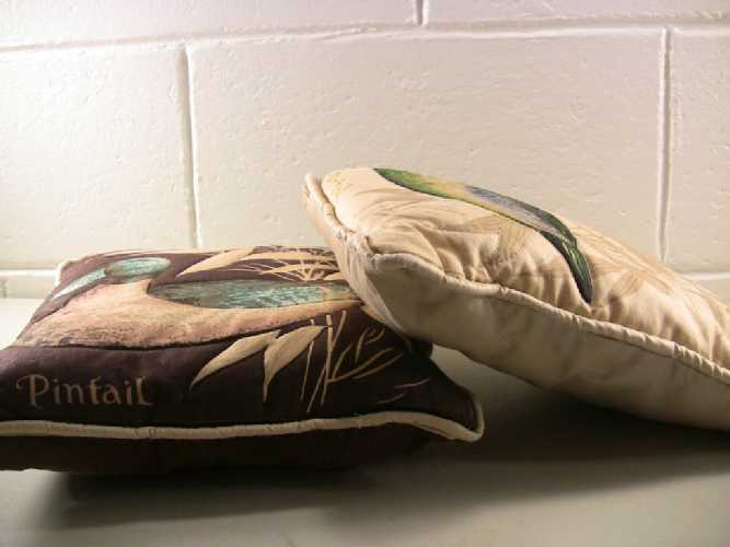These pillows appear to have been made from a pillow kit, with the crafter assembling the pillow, adding dimensional filling to the ducks, and finishing with hand-stitched outline quilting
