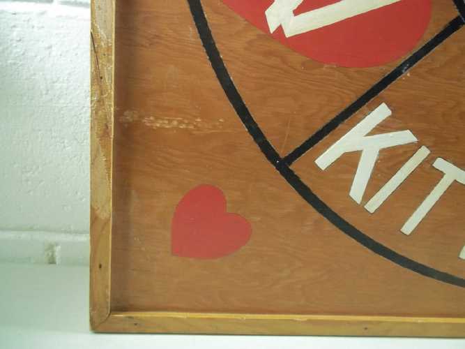 Old-fashioned varnish finish over red, white, and black hand-painted game design