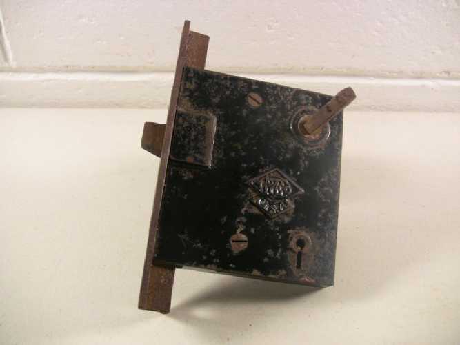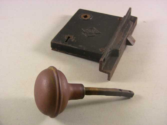 Antique door knob set in good condition with wear commensurate with age and use.  Knob stem is slightly bent at end.  Finish wear, surface rust, paint wear,and nice aged patina throughout.  One door knob and mortise lock, no key or back plates included.  Please see pictures for best indication of condition.
