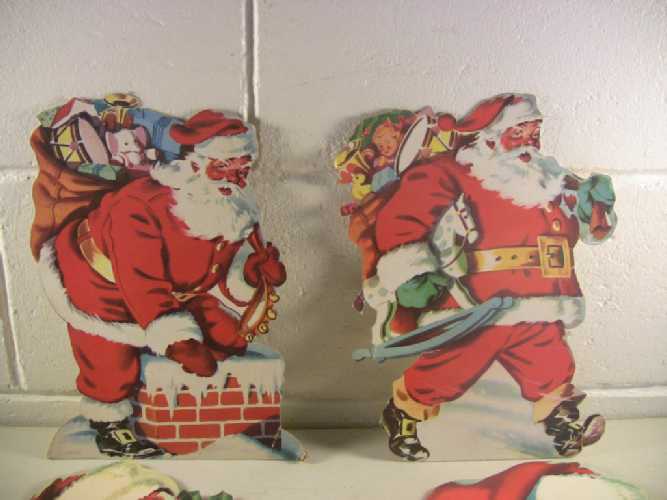 Good vintage condition with wear commensurate with age and use.  Aged yellowing, small edge curling and folds and tears present; creases in standing Santas; back easels on standing Santas either missing or floppy and damaged.  One of the Santa faces has no cardboard backing.