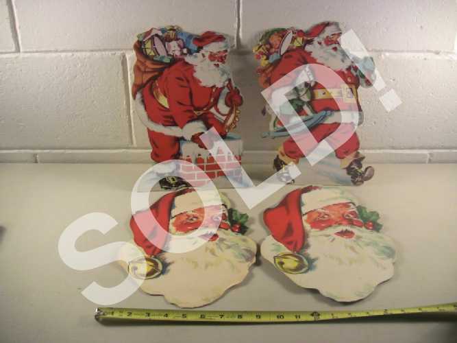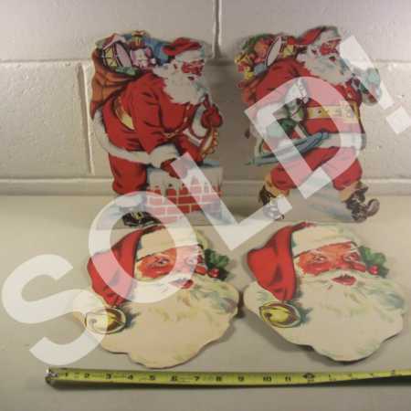 Set of 4 charming vintage paper Santa die cut decorations for wall and table.