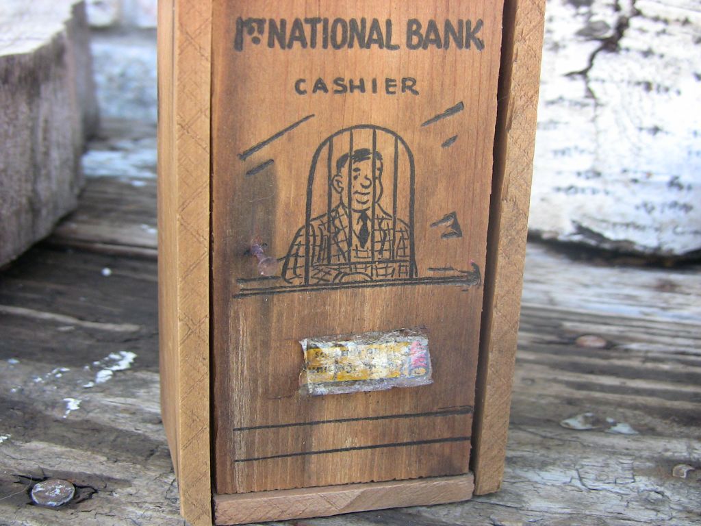 Front door cartoon graphics depict teller behind cage window under the heading "1st National Bank Cashier"
