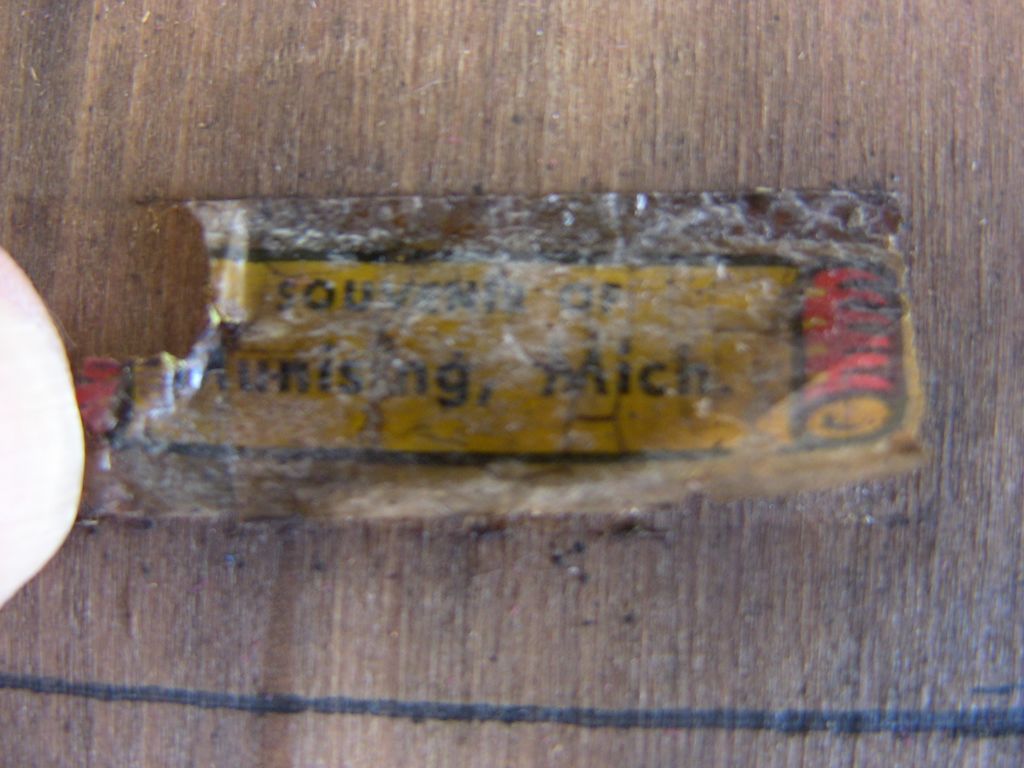 Red and yellow decal label reads:  Souvenir of Munising, Mich.