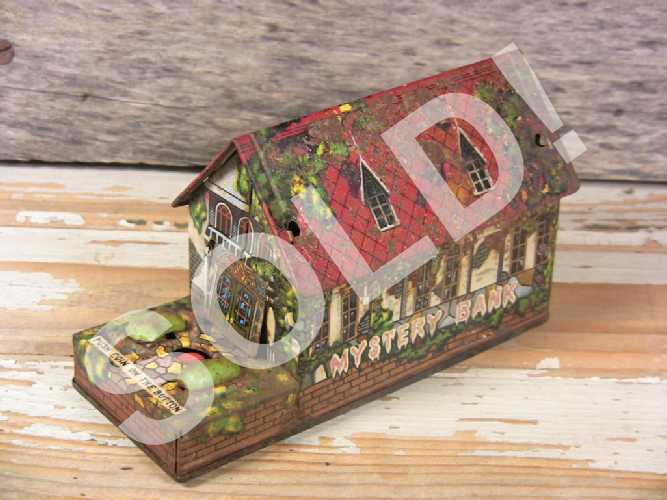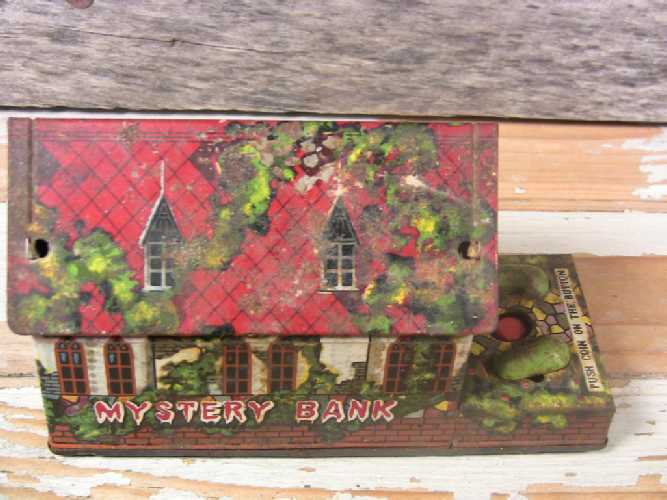 Good vintage condition with some surface wear and rust, but needs mechanical repair. Keywind winds freely and sounds like it's running properly, but hand does not advance out to grab and pull the coin; also, the coin button is floppy and does not activate the mechanics; the mechanics may need a repair or just a good oiling. Surface rust and litho loss to about 15 to 20 percent of the bank. Selling in AS IS non-working condition with restoration and repair needed; priced accordingly.
