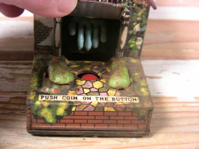 The way the bank is supposed to work:  A giant hand emerges from the building door to snatch a coin off the magic button and drag in back inside the bank vault (access door on bottom)