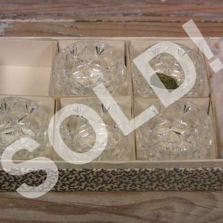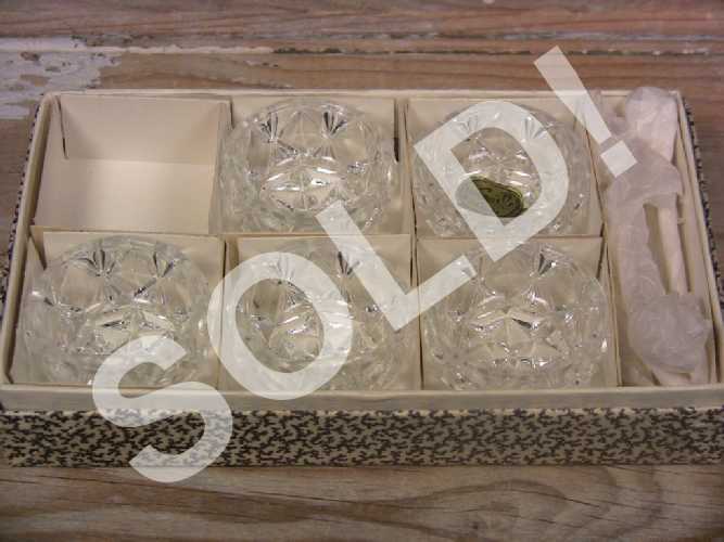 Vintage set of cut glass salt cellars with spoons in mint condition with no damage or evidence of use. Set includes five cellars and 6 spoons (one cellar is missing). Five of the six spoons are still wrapped in the original tissue, as if never opened. Beautiful set in original cardboard gift box; box in very good condition with no issues.