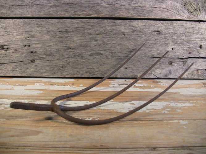 Antique 3-tine pitchfork head in very good used condition. Completely covered in surface rust. Does not include wood handle. Barn salvage.
