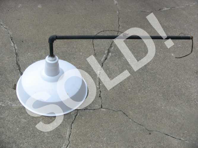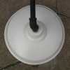 Used industrial light in very good condition with wear from age and use. Metal shade in good condition with some speckles of surface rust here and there; a few nicks, scrapes, dents and dings, rim slightly out of round. White powder-coat finish is in very good condition, interior and exterior, with light wear and tear. This light was salvaged from a flea market demolition and being sold in AS FOUND condition, except for cleaning. Wiring should be inspected for safety by a professional before use; may need to be rewired. Black painted iron poles show some medium surface wear and rust throughout.