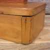 Vintage wooden lidded box in good condition with finish wear, especially on the lid handle; one corner has wood splits and nail repairs, otherwise sturdy.