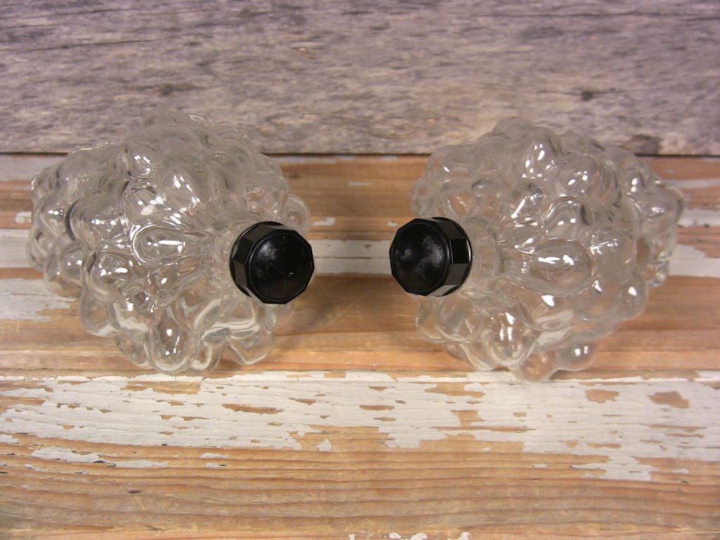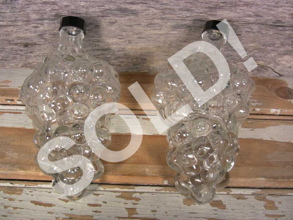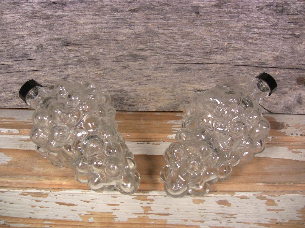 Pair of vintage clear glass grape bunch bottles in mint condition with no damage. Clean and clear. Original bakelite screw-on caps included. Display beautifully.