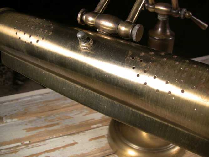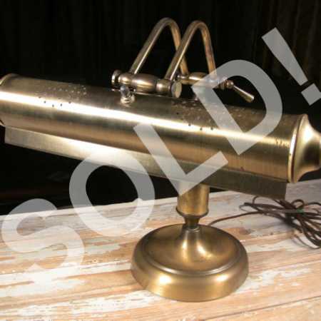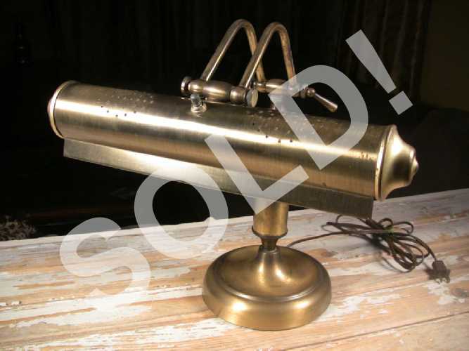 Vintage antiqued brass adjustable desk or piano lamp in very good condition with wear from age and use. Medium heavy finish wear throughout, including base, column, shade and end caps. Some light surface rust at the areas of wear. Electrical cord and plug in good condition. Lamp is in good working condition; all 3 adjustable positions functioning and holding adjustment. Two standard socket tube bulbs working and included, but WILL NOT be guaranteed through shipping. Lamp is nice and clean.