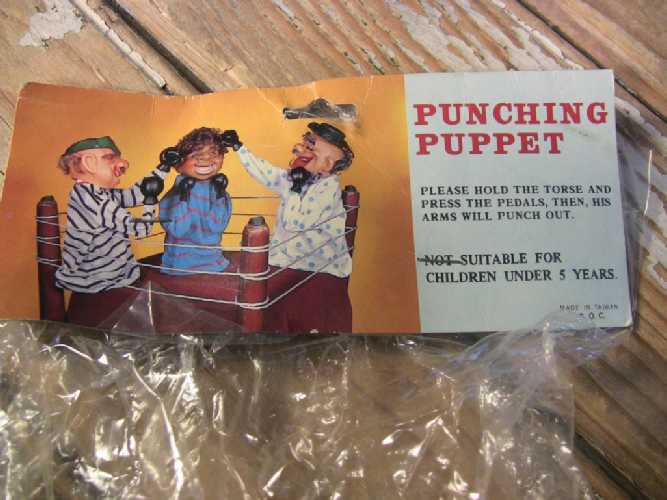 Mechanical punching arms action operated under shirt by pressing pedals while holding post; head bobbles around when punching