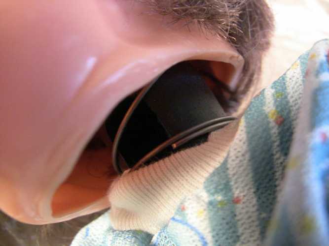 Plastic doll puppet parts, synthetic doll hair, fabric shirt