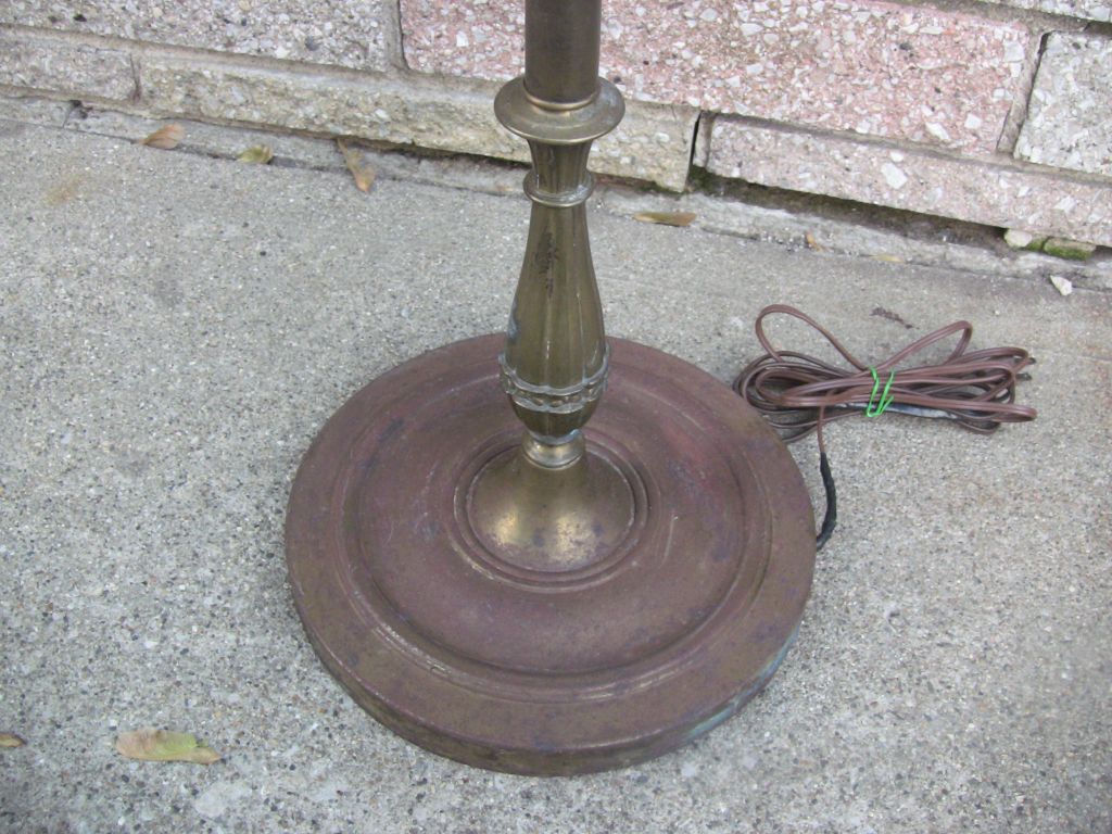 Vintage Rembrandt cast iron and brass metal swing arm torchiere floor lamp in good condition with wear and rust from age and use. Finish wear and surface rust throughout the lamp parts, especially the mogul socket cover and the base. Swing arm works well, swings inward and outward. One pole spacer is cracked, as shown in pics. Original electrical cord is taped--needs replacement. Light works good, socket and switch good. No glass shade included. Pretty vintage art nouveau swing arm floor lamp needs a little restoration work to bring it back to glory, but will be well worth the effort and give many more years of service.