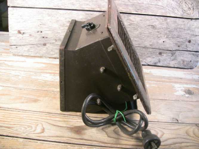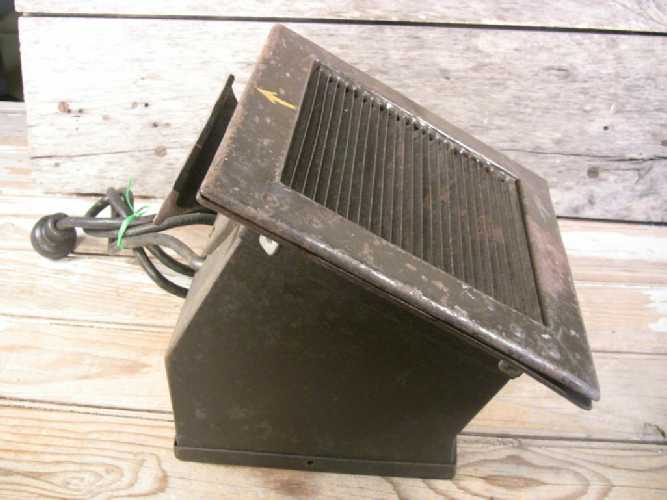 Antique heavy duty variable speed box floor fan in good condition with wear and rust from age and use. Fan is in good working condition, but makes a little clicking when positioned a certain way, but not another way--probably just needs interior tightening. Nice green enamel speed dial with Off-1-2-3 settings. Heavy paint wear and patina, some surface rust throughout. Yellow arrow painted on face. Some dings and dents. Some floppy tightening screws on cage. Electric cord and plug in good shape with no damage, seem to be original. Really nice antique shop fan in apparently good working order for fan collectors, and fits in well with industrial steampunk decor.