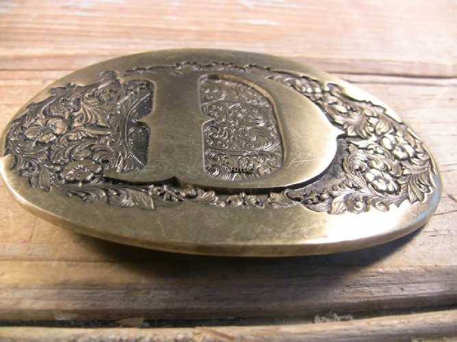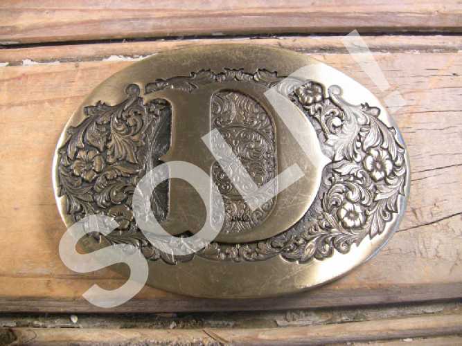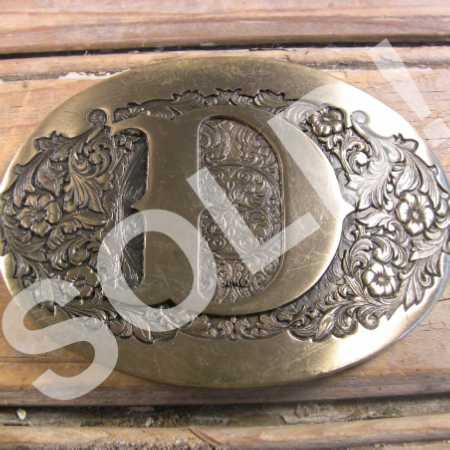 Solid brass western style belt buckle features the letter "D" surrounded by intricate flowers and scrolls