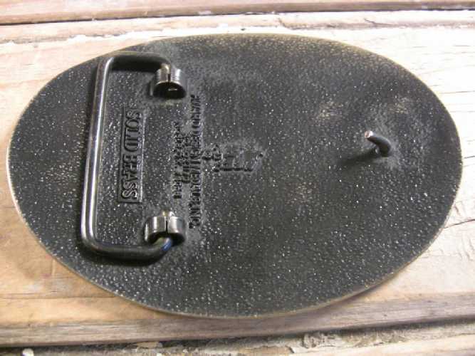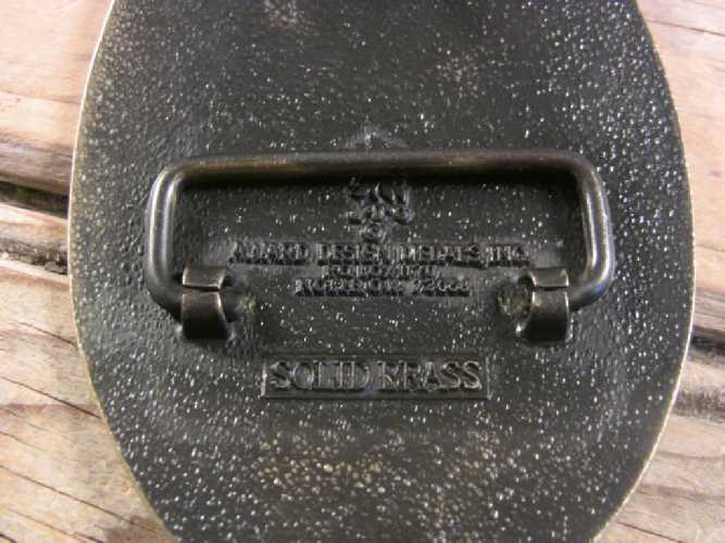 Made in the USA by Award Design Medals, Inc. (now defunct) out of Norman, OK; logo ADM markings on front and back of buckle