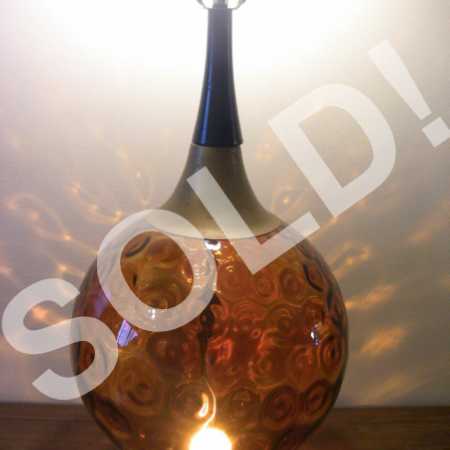 Optic coin dot amber glass orb base, black tapered wood neck, gold metal collar and base...