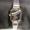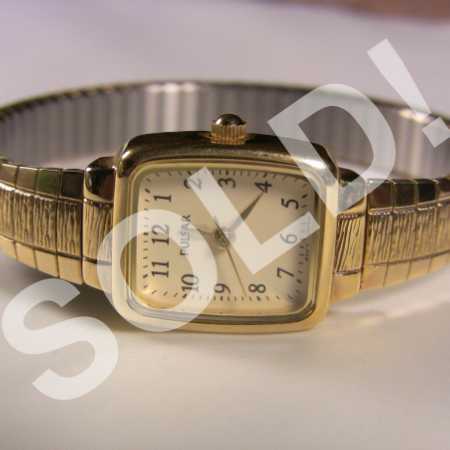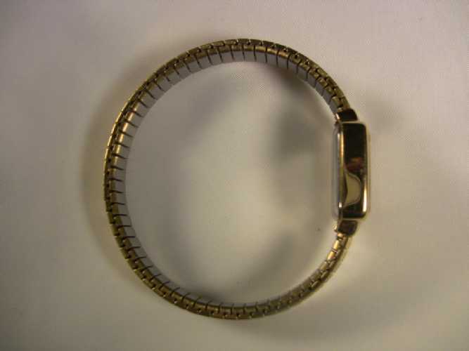 Pre-owned vintage ladies gold tone stretch band wristwatch in very good vintage condition with light wear from age, use, and storage. Light finish wear throughout the watch and band. Needs new battery. Fashionable vintage ladies quartz wrist watch features analog face with standard numbers all around, second hand, and gold tone metal flex band.