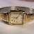 Fashionable vintage ladies quartz wrist watch features analog face with standard numbers all around, second hand, and gold tone metal flex band.
