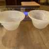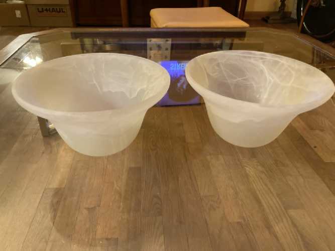 Vintage faux alabaster glass torchiere light shades in good condition with light wear. A few wear marks on body and some tiny flea bites on edges. No other chips, cracks or damage. These beautiful faux alabaster torchiere light shades can be used as replacements for many contemporary light fixtures.