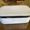 Vintage enamelware refrigerator storage box with removable lid in fair to good condition with heavy staining and significant areas of enamel loss and rust. Heavy enamel losses and rust on the black edges of lid; heavy staining on the interior and bottom of box; large, deep rust spot on the exterior bottom center. Use this classic vintage enamelware storage box to organize odds and ends in your farmhouse kitchen.