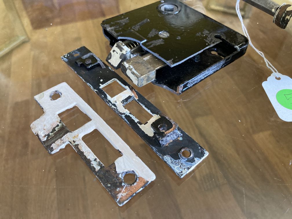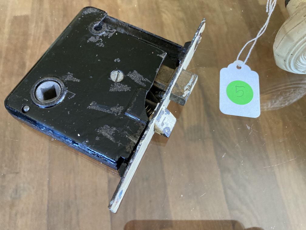 - Unmarked mortise lock set, damaged during salvage removal