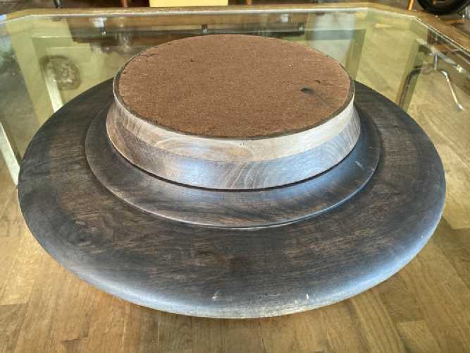 Large, beautiful, vintage, solid wood lazy susan tabletop turntable in very good condition with light wear from age and use. Light wear to the black walnut finish. Wood is a little dry--could use a good polishing. One tiny nick in the rim. Turntable ball bearings are a little noisy and sticky, but still turns freely. Felt on bottom to prevent table scratches, shows wear, marks, and losses. Large vintage tabletop turntable can be used to hold serving items for dinner, or decorated would make a fabulous tabletop vignette.