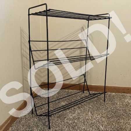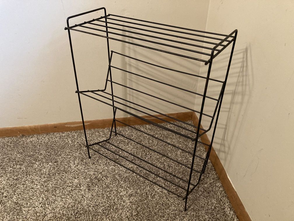 Organize your books, records, cds, dvds, or vhs movies with this vintage mid century two-tiered wire rack with angled shelves; top is level for use as a side table.