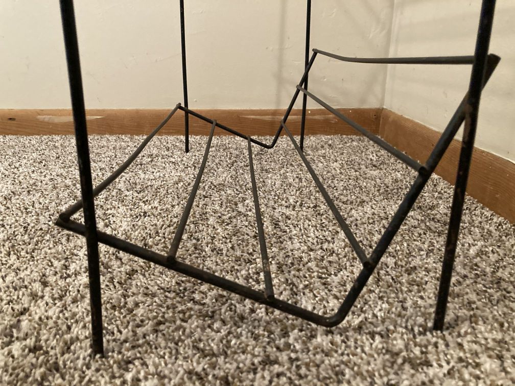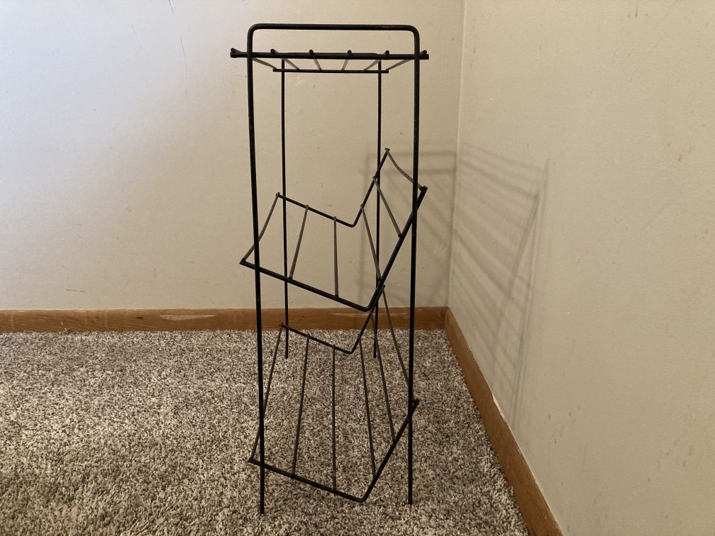 Vintage mid century black wire book rack in good condition with wear from age and use. Paint wear and light surface rust here and there throughout the rack. The back rungs of both angled shelves have slight bend, as does front left leg. One plastic cap on the front left leg is pushed upward on the leg. Organize your books, records, cds, dvds, or vhs movies with this vintage mid century two-tiered wire rack with angled shelves; top is level for use as a side table.