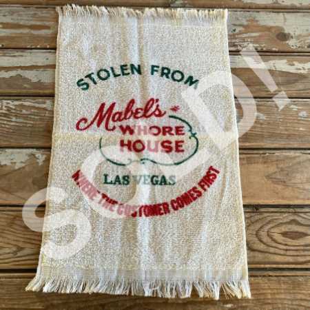 - Naughty vintage novelty hand towel in excellent condition, appears unused. Yellowing throughout from age and storage; has not been laundered. Naughty vintage hand towel features spicy humor stating Stolen From Mabel's Whore House...great for bachelor pads and mancaves, also golf and bowling bags.