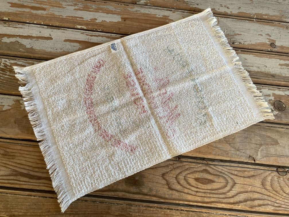 Naughty vintage novelty hand towel in excellent condition, appears unused. Yellowing throughout from age and storage; has not been laundered. Naughty vintage hand towel features spicy humor stating Stolen From Mabel's Whore House...great for bachelor pads and mancaves, also golf and bowling bags.