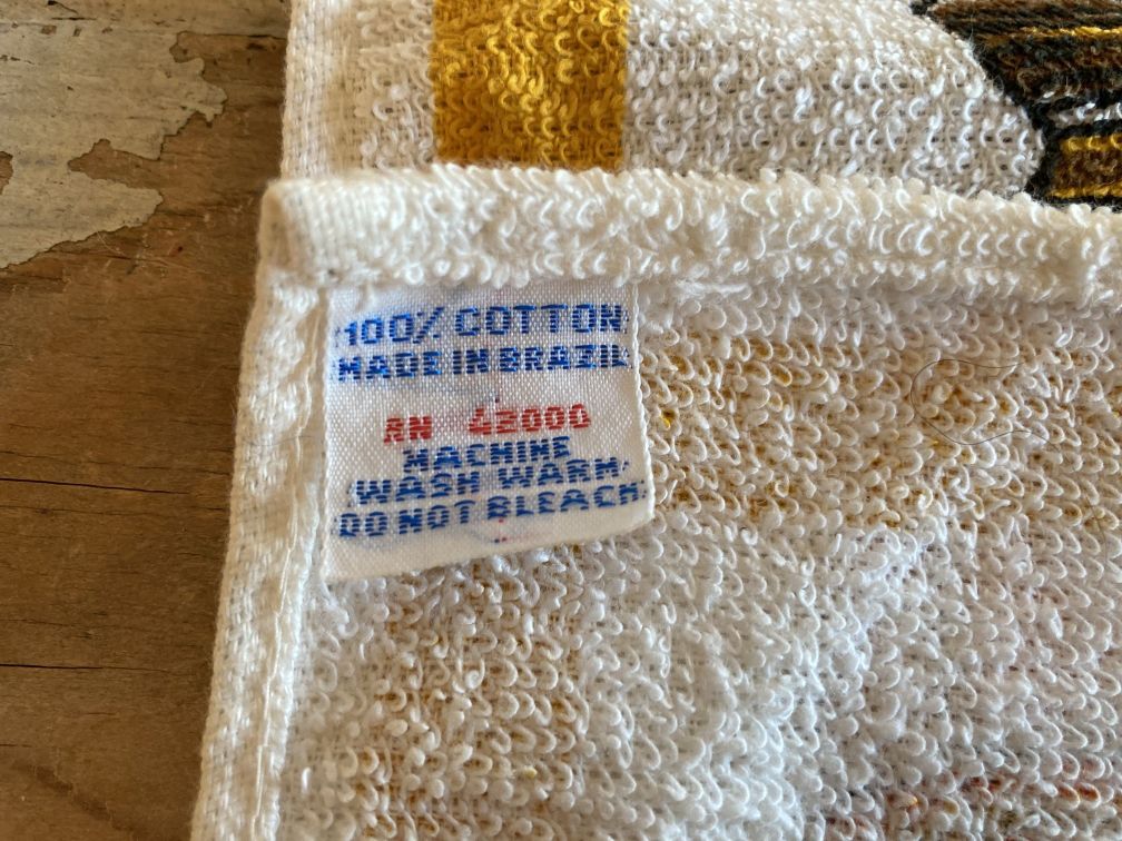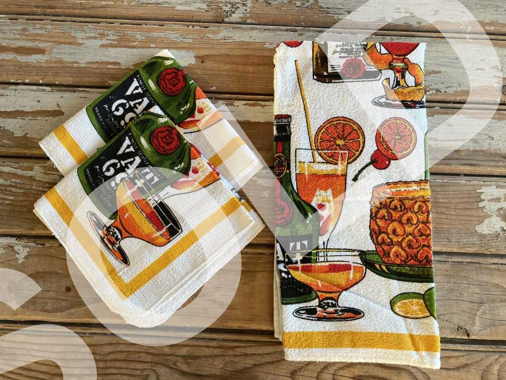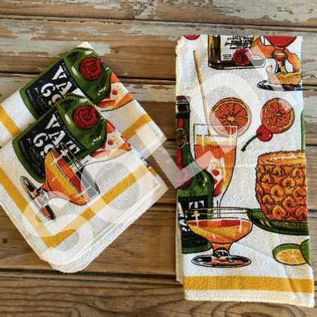 - Vintage three-piece bar towel set in excellent, unused condition, bright and cheery. There is one fabric flaw in a corner of one dishcloth, and maybe a few minute flaws throughout. Bright and bold mid century bar towel set features cocktails and liquor bottles in orange, green, gold, black, and red against a white terry cloth background.