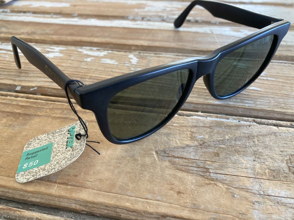- Vintage black plastic wayfarer sunglasses by Optek in excellent, unused condition; never used, still has original tag attached. No damage.