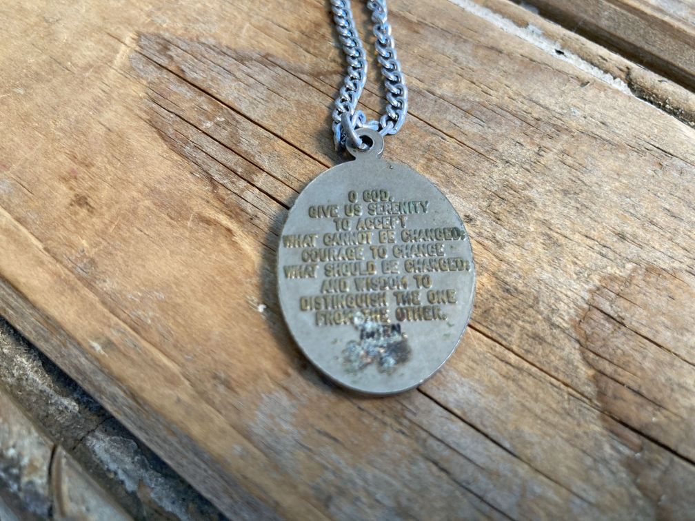 - High relief Praying Hands; full Serenity Prayer on back; some oxidation on back at bottom of prayer exposing shiny metallic yellow–may be brass