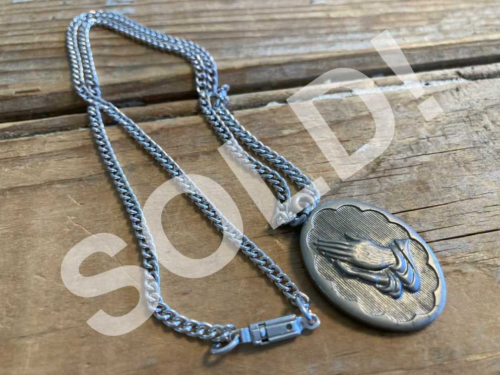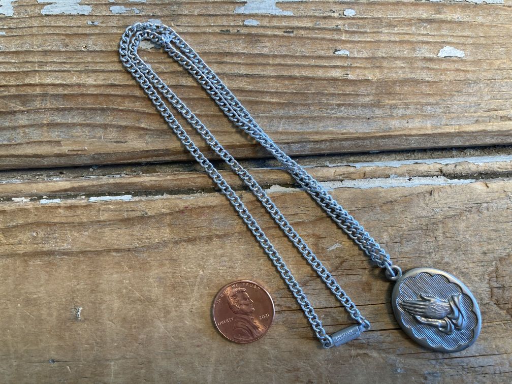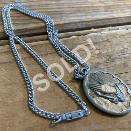 - Vintage 18” Praying Hands chain pendant in very good condition with some oxidation on back prayer. Nice vintage religious pendant necklace dates back to the 1960s and features Praying Hands on front, and the Serenity Prayer on back; suitable for guys or gals.