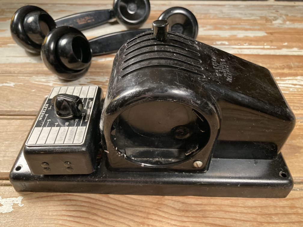 - Vintage Wheeler Self Powered Telephone unit is missing covers and possibly other loose or missing parts; UNTESTED and selling AS IS, as pictured; lot includes two separate Bakelite hand receivers. Interesting vintage Wheeler Self Powered telephone is missing covers and possible other parts, and is being sold in AS IS condition; lot includes two separate black Bakelite hand receivers with unusual mouthpieces.