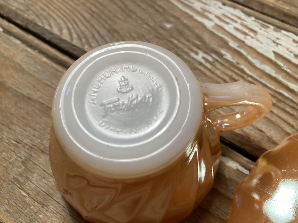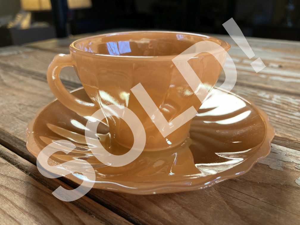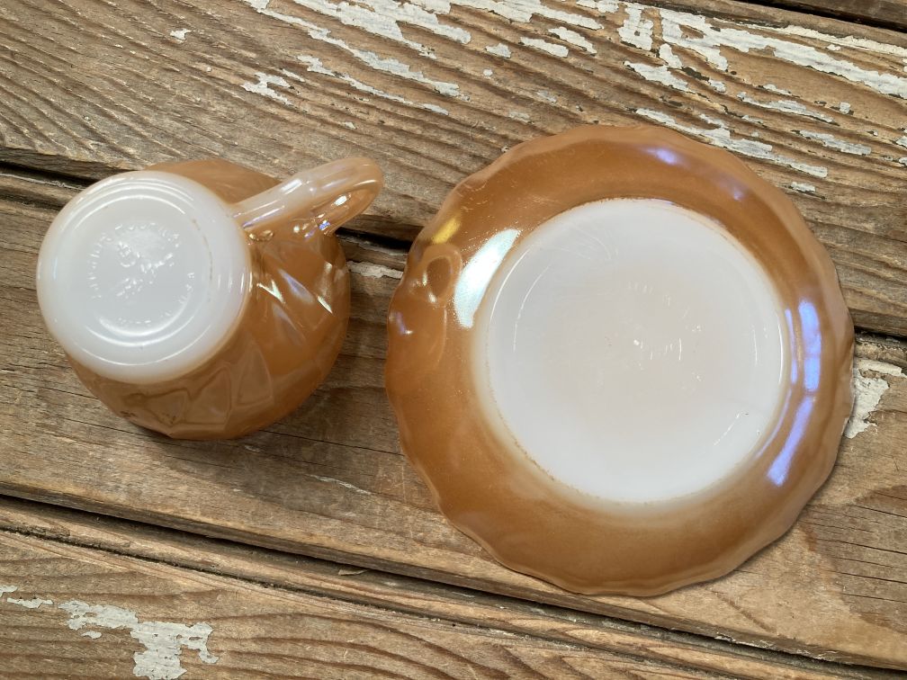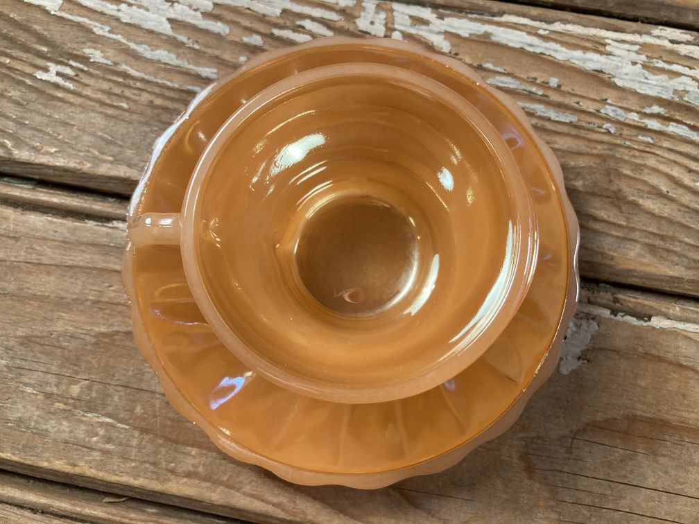 Charming little peach luster demitasse cup and saucer set from the Anchor Hocking Fire King line and swirl pattern.