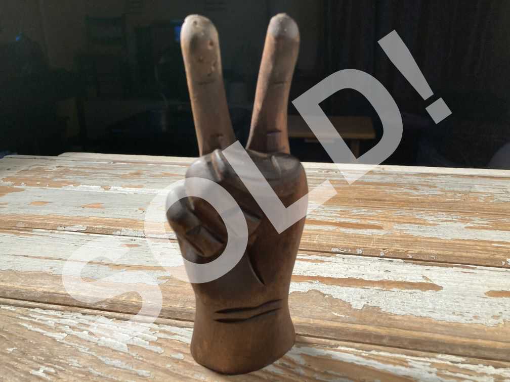 Vintage iconic carved wood peace sign hand in good condition except for a few pokes or chew marks in one finger tip, both front and back, as shown in pics; no other damage. Fresh polish with Old English to brighten and preserve the finish.