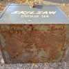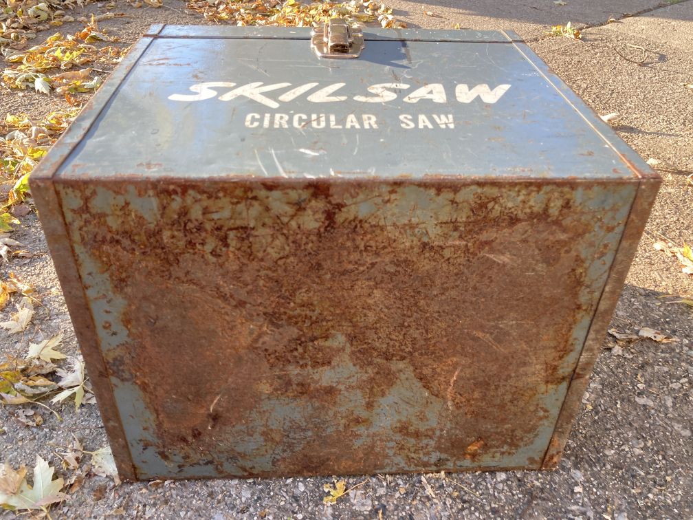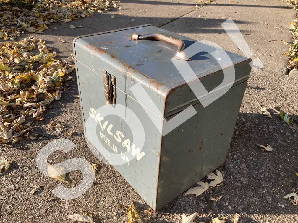- Vintage Skilsaw circular saw steel storage box in good condition with wear and tear, bumps, scratches, and dings from age and use. Some finish losses and surface rust, especially on the bottom, inside and out; paint splatters and drips here and there; writing on the exterior side in permanent marker - ‘scroller saw.’ Latch closure in good working condition. This vintage Skilsaw circular saw metal storage box is of quality construction and dates to the 1970s.
