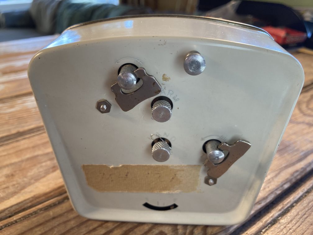 - Vintage alarm clock in non-functioning condition, selling AS IS, for parts or repair; winders are frozen. White enamel painted finish in good condition with light wear and tear; lens good with light wear; metal bezel lacquer finish is worn off; masking tape remnant stuck on back; may be missing a knob or two on back.