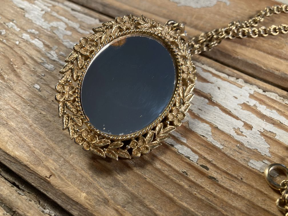 - Vintage Avon Pendant Necklace Rose Cameo Mirror 30-in Goldtone Chain 1970s 1980s