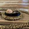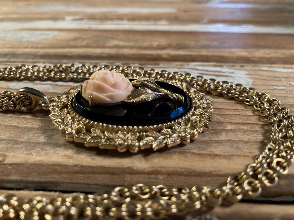 - Pendant features a 3D peach rose cameo with goldtone metal leaves and stem, set on a black oval base, and framed in a goldtone oval frame