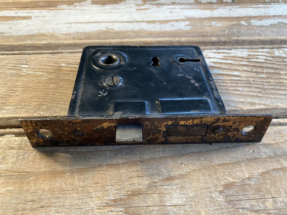 - Antique mortise lock and back plates in good condition with wear, tear, finish loss, and paint residue; no key, knobs, or screws included.