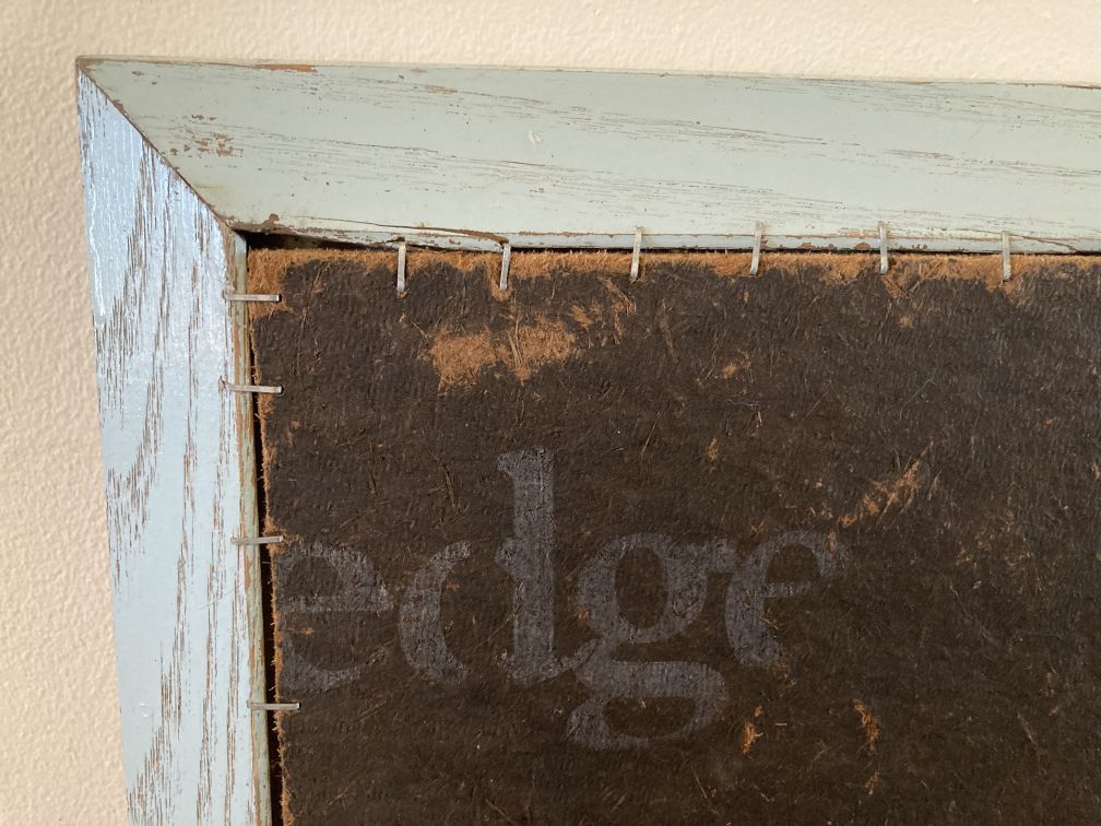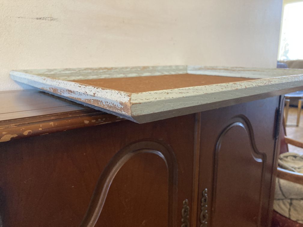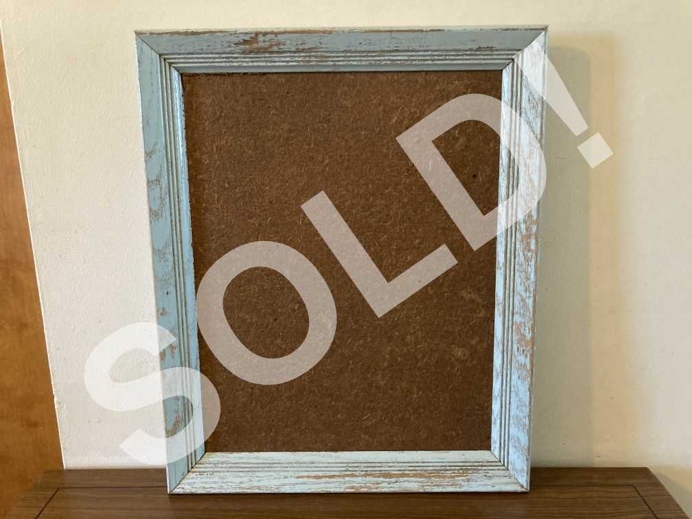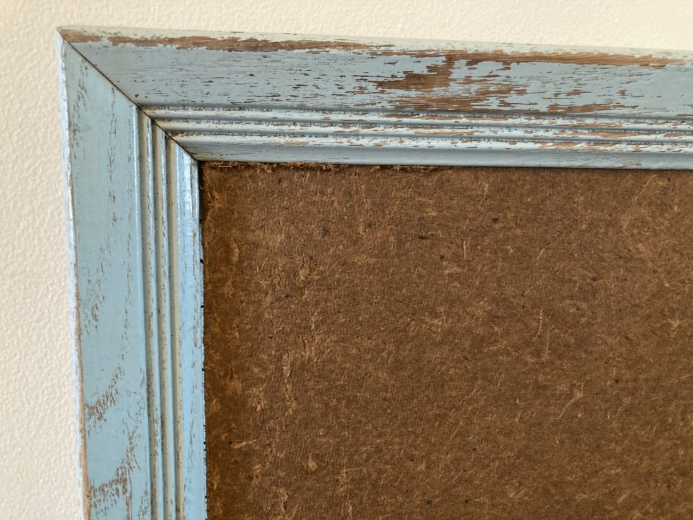 - Handmade, homemade framed bulletin board in good condition with light wear and tear; there are a few pokes here and there from prior use; back side is unfinished and shows staples; no hanging hardware. This charming bulletin board is handmade from a salvaged wood frame with weathered and worn aqua blue paint, and a cut piece of cork-like building material; it would be a pretty decorative accent for a beach house or kid's room.